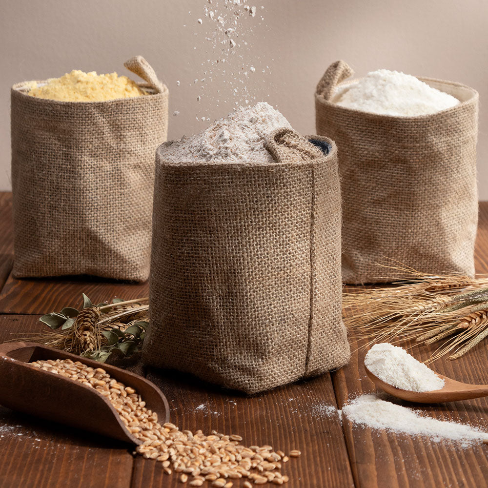 Dependiendo del tipo de preparación utilizamos harinas de arroz, almidón de maíz, fécula de mandioca, arroz integral y fécula de papa.